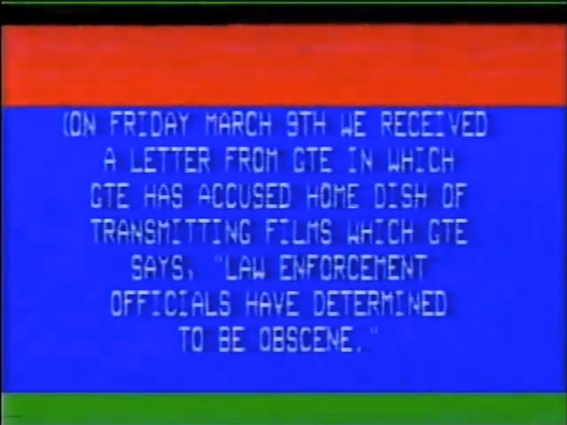 The on-screen messages cycled for a few days until the channel went dark forever. Of course, the reasons for the channel’s demise weren’t nearly as simple as an accusation of obscenity. As it happens, high school students in the American South (go figure) had been videotaping American Exxxtasy‘s programming and selling the tapes to their fellow students! Several parents filed suits which remained in a legal tangle for years. Therein, however, lies the rub.