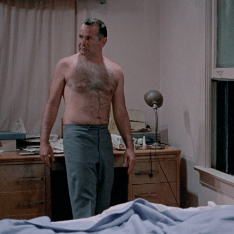 Walsh’s hang up goes beyond his aversion to “deviates.” Sex itself turns his stomach. Returning home after his in-drag vice bust, his comely landlady attempts to seduce him. A nude Walsh sees her undressing across the hall but drapes on his bathrobe, a layer of protection from carnality, before taking her on the bathroom floor. Despite her pleas for more, Walsh can’t close the deal and sulks back to his own apartment where he rubs one out in desperation. Even that act of self-satisfaction repulses him.