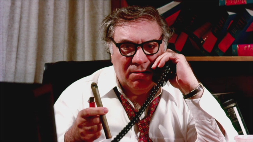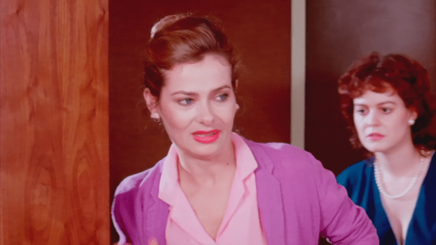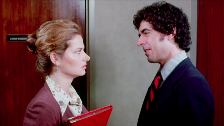 The supporting cast is full of familiar faces. Samantha Fox has a small role as a stock trader, Ron Hudd and George Payne turn up as sexual conquests, and the glorious Sharon Mitchell appears by literally rising up behind a copulating couple and joining in. She has no dialogue, but her appearance is memorable. The non-sex cast is fun as well. Kurt Mann plays a hilariously swishy board member with an arched-eyebrow and knowing glint in his eye. A veteran of many-a sex film for The Amero Brothers, Mann is always terrific comic relief. He would wrap up his onscreen career a few years later with a bit role in PASSAGE THRU PAMELA, and he is in his prime in Wanda. Another non-sex regular is on hand, Patricia Dale, as the wonderfully acerbic office shrew. Another noteworthy performance is the actress who plays the burgled executive’s wife. She is a delight, an absolutely highlight of the film. Her identity, sadly, seems to have been lost to the mists of time.