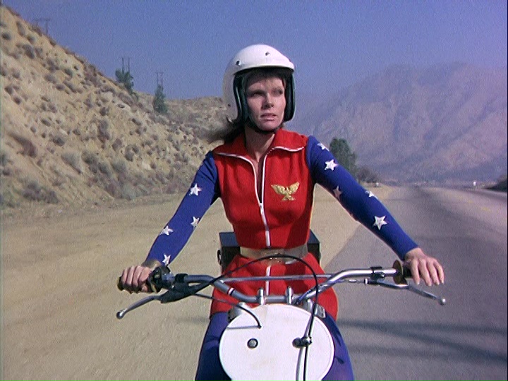 While a bustier would have been out of place for this version of Wonder Woman, the costume they do come up with is just plain silly. The high-collared zipper jacket and tights make Crosby look more like a female Evel Knievel than a superheroine, but she does get a nifty “utility belt” and bracelets that double as grappling hooks.